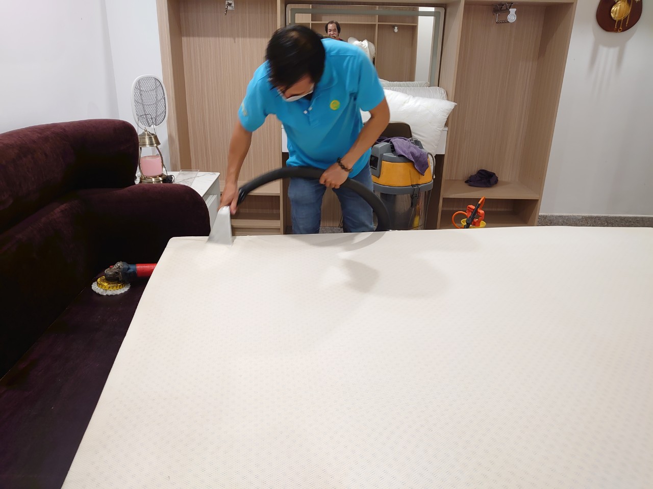 Bước đầu tiên là sử dụng máy hút bụi công nghiệp để loại bỏ lớp bụi bẩn, mạt vải và các tạp chất bám sâu trên bề mặt nệm. Sau đó, các vết bẩn cứng đầu sẽ được xử lý bằng các sản phẩm hoá chất chuyên dụng.